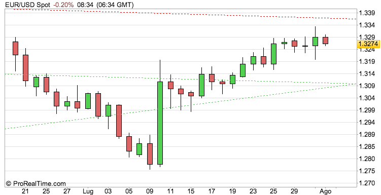 Il cambio Euro/Dollaro ha avviato il mese di luglio in zona 1.30, si è poi spinto al rialzo fino a 1.27 per poi riprendere a salire nella seconda metà del mese, fino a sfondare (una falsa rottura) la linea 1.33, rotta ieri dopo la pubblicazione delle dichiarazioni del FOMC.
