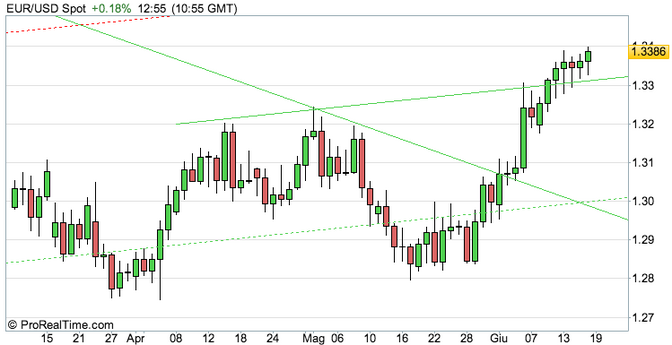 In questo momento il trading sul cambio si aggira in zona 1.3380, in un range compreso tra 1.3350 e 1.34. La resistenza a 1.34 comincia ad essere sotto pressione e la prossima si individua a 1.3434.