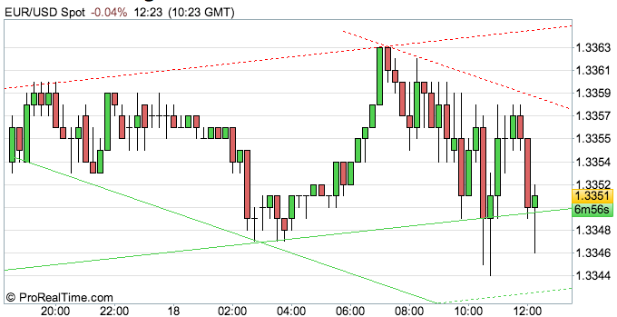 Durante la sessione Asiatica, il cambio Euro/Dollaro ha subito pochi movimenti raggiungendo un massimo a 1.3364 prima di consolidare in area 1.3361. Nella stessa zona si svolge il trading sull’Euro/Dollaro nella mattinata Europea durante la quale assistiamo ad una lotta piuttosto concitata tra tori e orsi ben visibile dal grafico a 15 minuti.