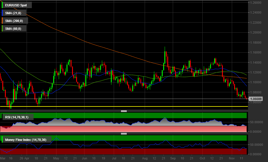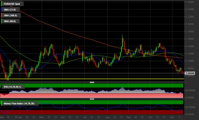 L’Euro-Dollaro questa mattina ha toccato i minimi intraday a quota 1,0643 proseguendo la discesa di ieri seguita agli attacchi terroristici di Parigi.