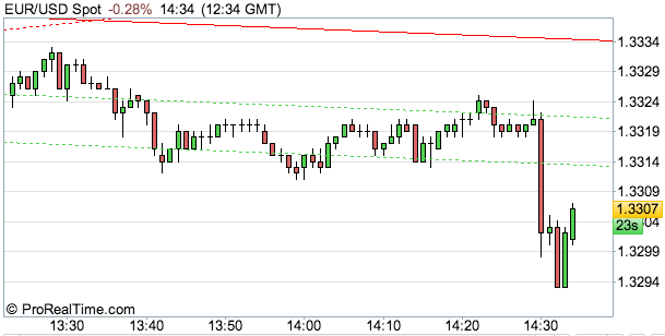 La pubblicazione dei dati USA ha riportato letture migliori dell’atteso e il cambio Euro/Dollaro passa in un minuto da 1.3320 a 1.33, scendendo anche al di sotto della linea 1.3294, ma poi riprende leggermente a salire.