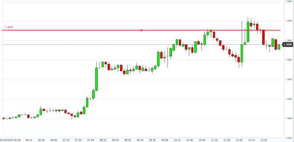 Il sentiment positivo sull’Euro è forte e l’annuncio della notizia sui LTRO ha dato origine ad una fase di test della zona 1.3450 (linea rossa). In caso di sfondamento, la resistenza successiva sarebbe rappresentata dalla linea 1.3480.