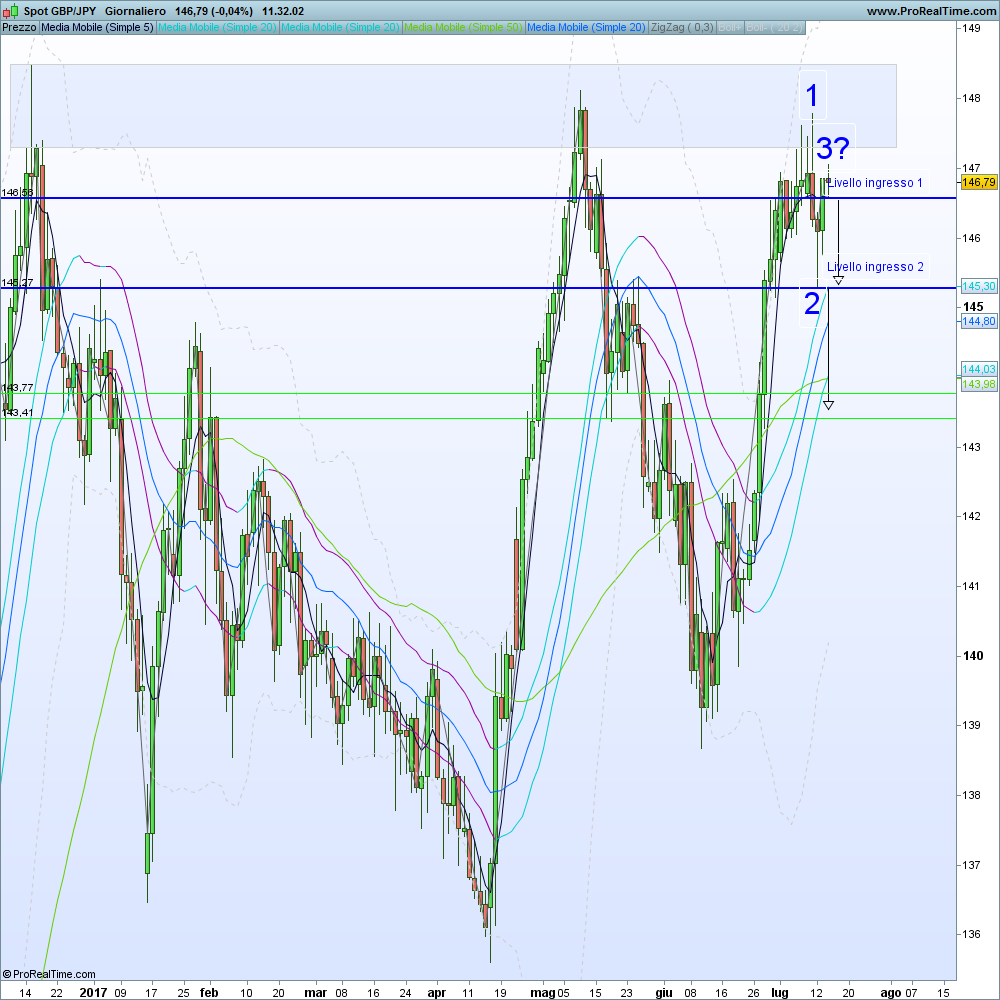 Osserviamo infatti che dopo aver definito un massimo a quota 147,78 (punto 1) l’11 luglio 2017, i prezzi hanno formato un minimo relativo (punto 2) a quota 145,27 il 12 luglio 2017 prima di risalire definendo un secondo massimo (potenziale punto 3) a quota 147,05 nella sessione odierna.