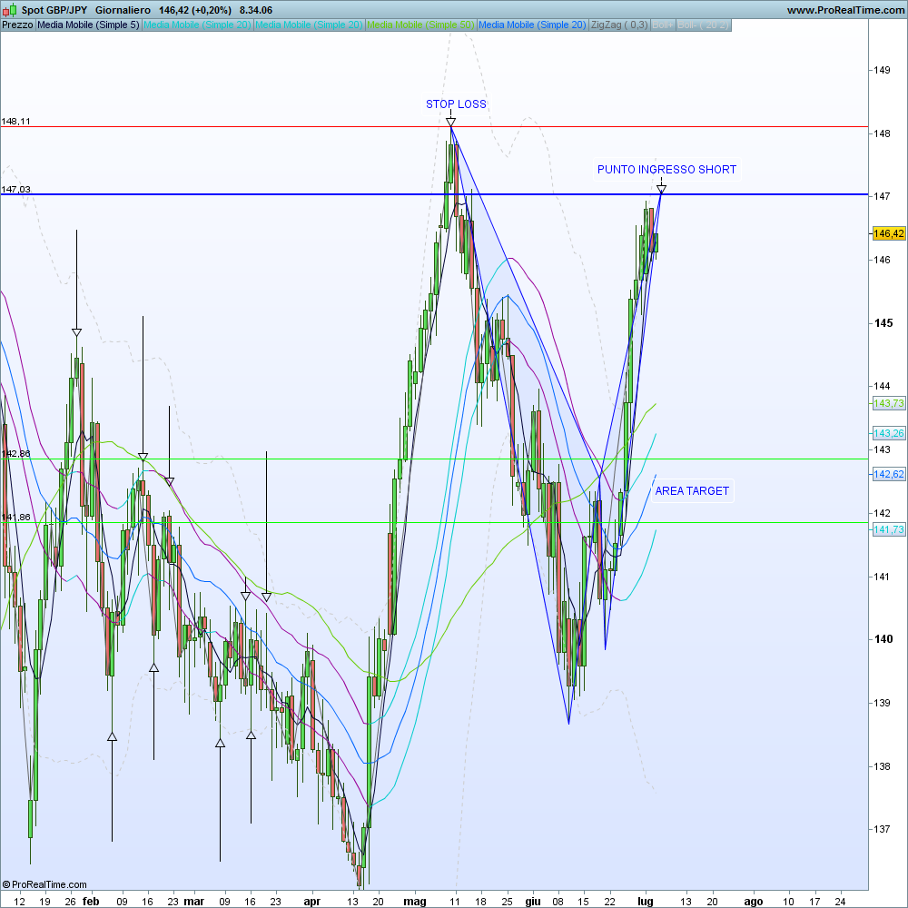 Osservando il grafico giornaliero del cambio GBP/JPY è possibile notare la struttura tipica di un bearish bat pattern. La figura rispetta le proporzioni elencate in precedenza e potrebbe offrire una buona opportunità di ingresso short.