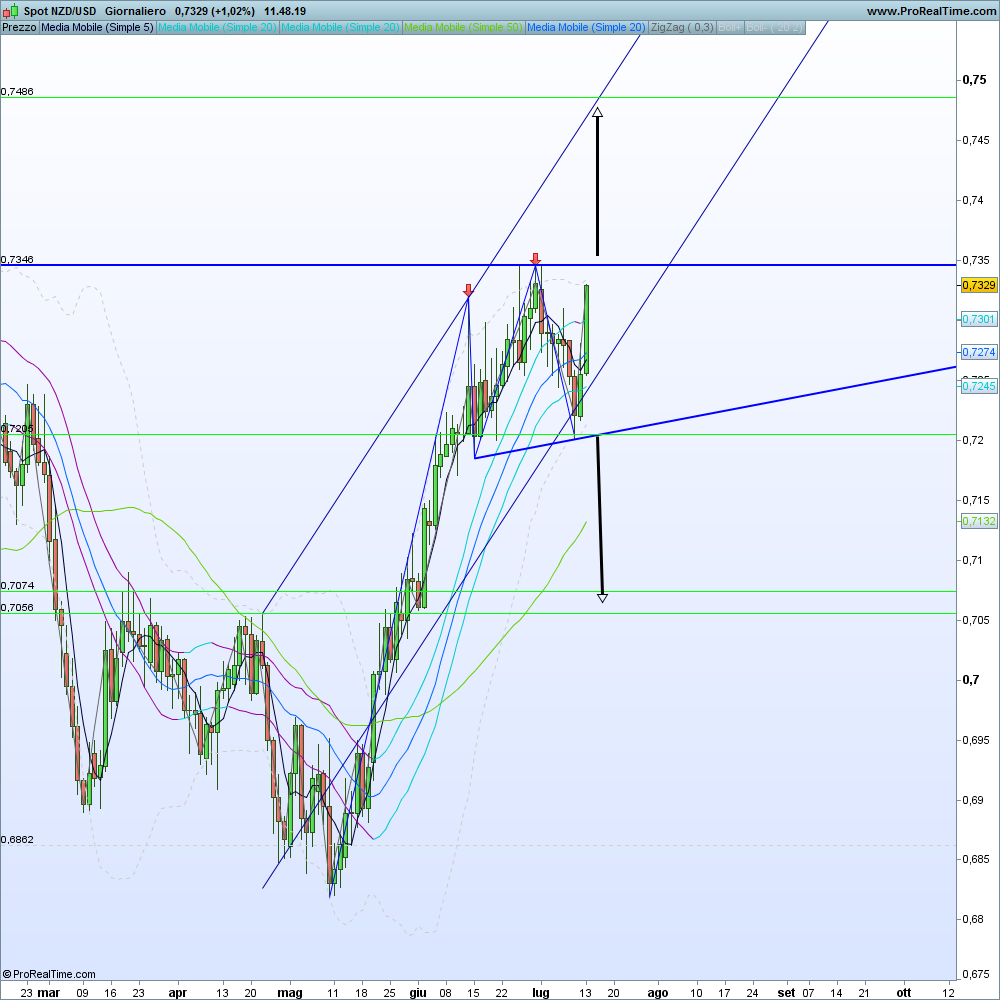 Scenario long: se i prezzi rompono la resistenza in area 0,7346, confermata da una chiusura giornaliera, verrebbe invalidato il testa e spalle con la possibilità di seguire il trend rialzista in atto. In tal caso il target può essere posizionato in area 0,7846 in corrispondenza della trendline rialzista di breve/medio periodo che accompagna il movimento al rialzo.
