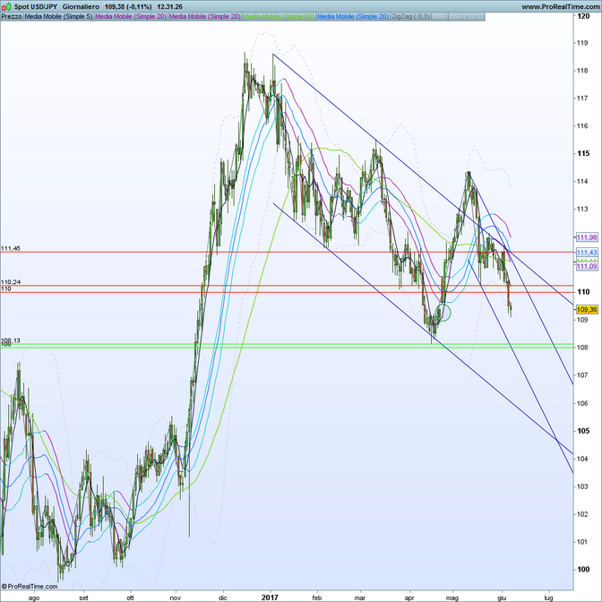 Il cambio dollaro yen vede un andamento decrescente sul grafico giornaliero sotto riportato, scambiando all’interno del canale ribassista che parte dal massimo segnato a quota 118,61 il 3 gennaio 2017 fino al minimo segnato a quota 108,13 il 17 aprile 2017.