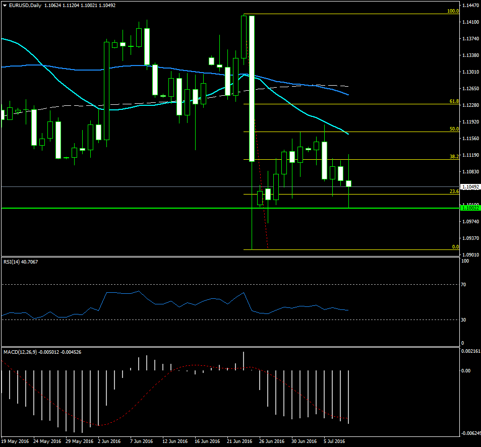 Per quanto questo livello possa attrarre nuovamente la quotazione, come ha già fatto negli ultimi giorni, l’impressione è che la rottura dell’1,10, in verde, rischi di condurre senza troppe difficoltà il cambio euro-dollaro lungo quota 1,09 fino al minimo registrato a 1,091 durante la notte del referendum.
