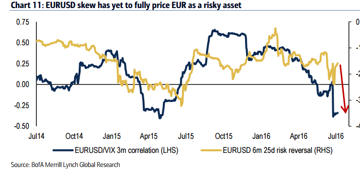 Euro non sale più con il salire del rischio e dei timori dei mercati. Una spiegazione, individuata dalla Bank of America Merrill Lynch è da ricercare nella Brexit, che ha gettato nello shock l’Europa e messo al rischio il futuro della moneta unica..