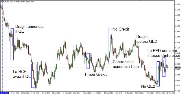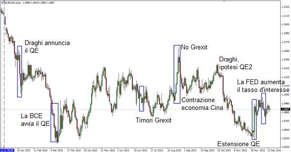 Nelle sue numerose conferenze stampa il presidente della BCE Mario Draghi ne aveva dato anticipazioni a partire dal 2014 e già da allora il cambio EUR/USD veniva scosso al ribasso, il 22 gennaio la notizia diventa ufficiale: la BCE inizia il suo Quantitative Easing, un programma di immissione di liquidità dal ritmo di 60 miliardi di euro al mese, una grande inversione di rotta per la BCE e per la sua valuta (-500 pip).