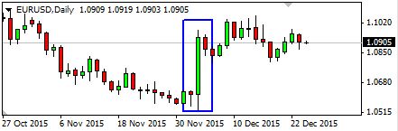 L’ipotesi di un quantitative easing più intenso viene messa da parte: nella sua conferenza stampa Mario Draghi comunica la decisione della BCE di estendere il QE fino a marzo 2017, ma senza aumentarne l’intensità. La scelta è vista come una vittoria per i falchi e il cambio euro-dollaro guadagna 460 pip in poche ore, allontanandosi dalla parità.