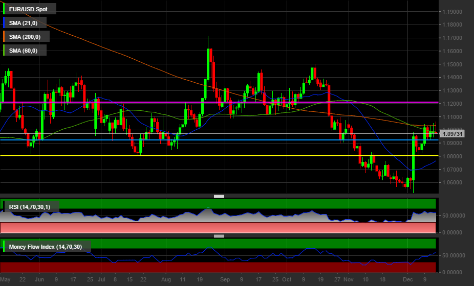 L’Euro-Dollaro è in salita da quando la BCE ha annunciato il nuovo programma di stimoli che ha deluso le aspettative del mercato. Il mancato aumento monetario del QE ha spinto la chiusura delle posizioni short sul cambio che, a distanza di giorni, ha portato l’EurUsd ad un allungo al di sopra di quota 1,10.