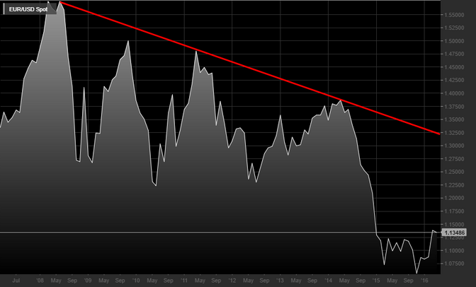 Nel settore si dice che “il trend è tuo amico (finché non viene rotto)”. Negli ultimi sette anni, il cambio euro-dollaro non è riuscito a rompere questo trend ribassista.