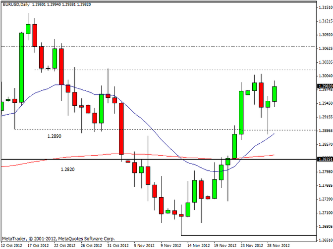 Il tasso di cambio euro/dollaro è tornato a lambire la resistenza di area 1,30, approfittando del clima positivo che si respira sui meercati finanziari all’indomani delle dichirazioni di Barack Obama, che si è detto convinto della possibilità di raggiungere un accordo sul fiscal cliff entro Natale. Le borse europee sono in forte guadagno e i futures americani corrono ancora al rialzo.