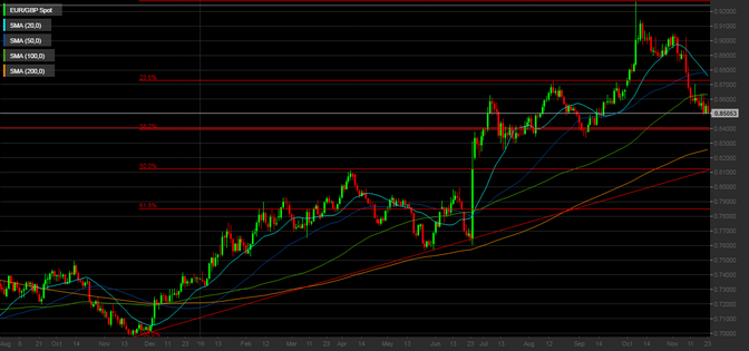 Il cambio euro-sterlina non va oltre 0,86 durante la mattina per poi ritornare al di sotto dei 0,85 nel pomeriggio con una performance giornaliera del +0,86%.