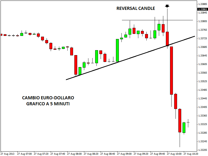Se si osserva il chart del tasso di cambio euro-dollaro, time frame a 5 minuti, si può notare la formazione di una reversal candle su una zona di micro-resistenza. Il corpo della candela evidenzia una forte pressione ribassista. Inoltre, la lunga upper shadow segnala una fase di esaurimento del trend. La comparsa di questa candela consente l’apertura di un trade short con rapporto risk/reaward molto allettante.