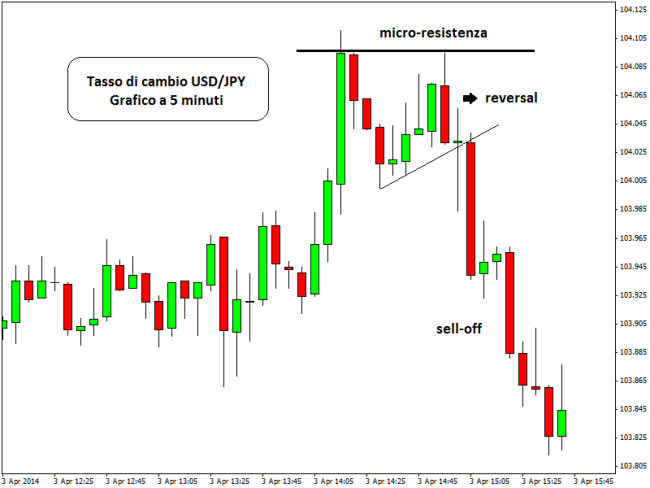 Il grafico in alto relativo al tasso di cambio USD/JPY (dollaro statunitense su yen giapponese), time frame a 5 minuti, mostra l’esaurimento di un bullish trend intraday a contatto con un’area di micro-resistenza molto importante posta intorno a 104,10. Il test fallito della resistenza viene confermato dalla presenza della candela reversal, che mostra una upper shadow piuttosto lunga e una chiusura molto debole. E’ un segnale short molto convincente, che offre allo scalper la possibilità di posizionarsi al ribasso con buone possibilità di guadagno.