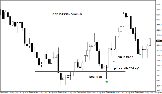 Il chart intraday appena mostrato evidenzia una pin candle di tipo “fakey”. Ciò vuol dire che considera contemporaneamente sia le caratteristiche delle classiche pin candle sia la presenza di un falso breakout di una candela inside. Tra l’altro si forma una netta “bear trap”, a seguito del fallimento del breakout di un micro-supporto. Pochi minuti più tardi il segnale long viene rafforzato da una nuova pin in trend, che favorisce il mini rally intraday dell’indice.