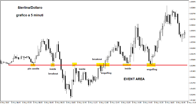 Il grafico in alto, relativo al tasso di cambio sterlina/dollaro, mostra l’alternarsi di situazioni indiscutibilmente accattivanti per il day-trader ogni volta che il prezzo viene a contatto con la event area (si possono notare breakout e tipici pattern di price action trading). Bisogna sottolineare che il time frame analizzato è il 5 minuti, utilizzato per lo più da scalper e/o day-trader, per cui il numero di “eventi” viene spalmato su un orizzonte temporale decisamente breve.