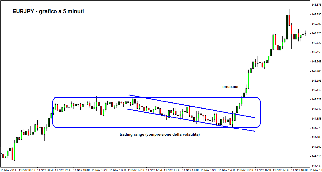 Quando appaiono fasi di forte contrazione della volatilità, meglio se contenute all’interno di un rettangolo o di un triangolo, è molto probabile che possa avvenire un breakout esplosivo in grado di scatenare un movimento direzionale dei prezzi. Per capire meglio questo contesto, possiamo dare un’occhiata al grafico intraday mostrato in alto sul cross EURJPY, time frame a 5 minuti. Da notare come, al superamento deciso del trading range, i prezzi mettano a segno un significativo boom nei minuti successivi.