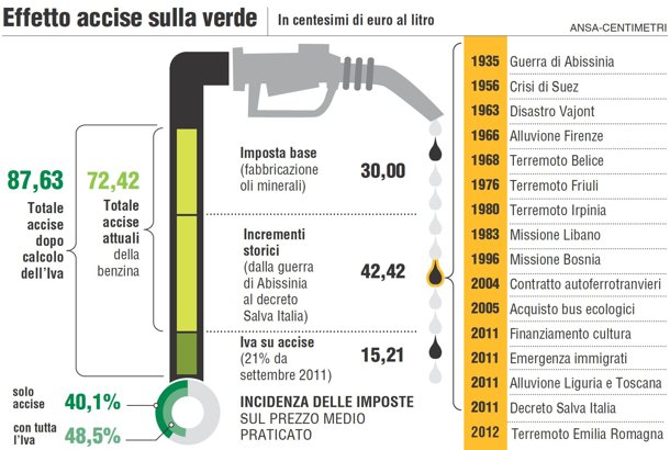 Perché il prezzo non scende?In gioco non c’è solo il prezzo del greggio, l’andamento del cambio tra euro e dollaro, l’inefficienza della rete distributiva, ci sono anche l’IVA e soprattutto le accise. Sempre negli ultimi 10 anni ne sono state aggiunte ben 7 tra emergenze vecchie e nuove. Giusto per dirne una, pensate che paghiamo ancora la guerra in Abissinia!