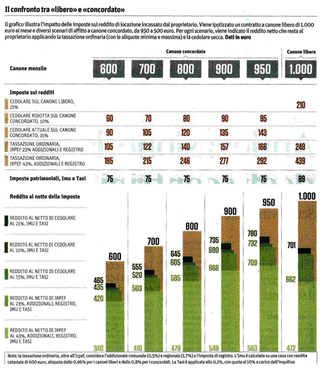 Due conti in merito a quanto risparmierebbe chi ha già stipulato un contratto convenzionato, l’altro ieri li ha voluti fare proprio il Sole 24 ore in un articolo a firma di Cristiano dell’Oste. Riducendo l’aliquota del 5 per cento, infatti, chi affitta un’abitazione con un canone di locazione di 300 euro mensili risparmierebbe circa 180 euro l’anno.