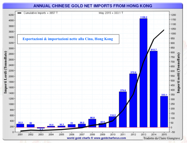 Anche se la Cina non esporta l’oro, lo importa. Dal 2010 ad oggi l’importazione cinese d’oro tramite Hong Kong hanno superato le 3,300 tonnellate.