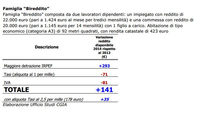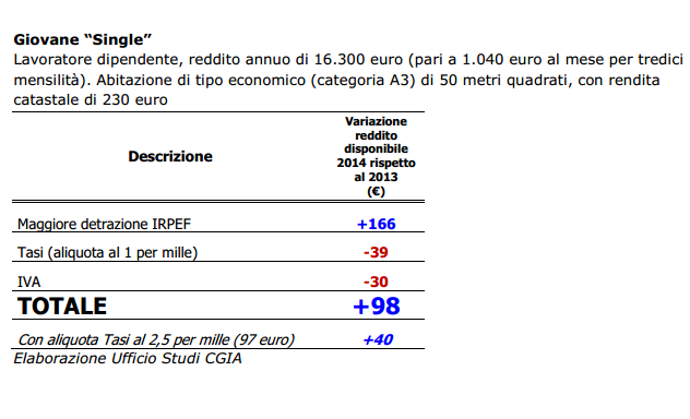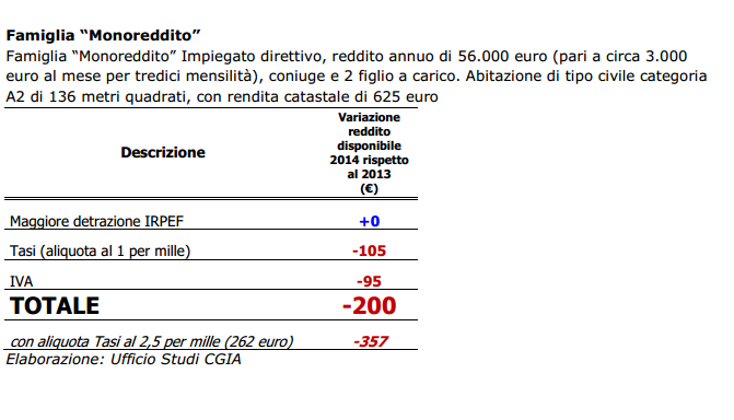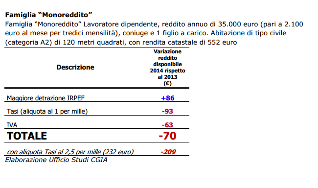 “Infatti, dovranno farsi carico sia dell’aggravio IVA sia della reintroduzione della nuova tassa sulle abitazioni principali che quest’anno non hanno pagato. Le famiglie con redditi attorno ai 20-22.000 euro circa, invece, godranno di un saldo positivo: la dimensione del taglio dell’IRPEF, infatti, sarà maggiore dell’aumento dell’IVA e dell’importo da versare con la Tasi”.