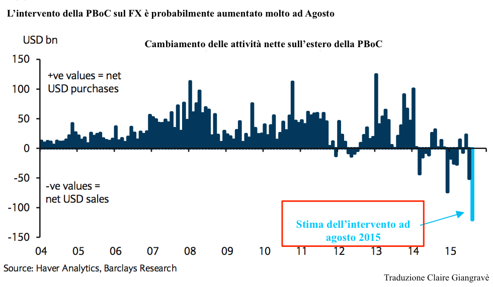 Gli analisti della Barclayìs dichiarano che la vendita delle riserve in valuta estera da parte della Cina per impedire la svalutazione dello yuan è insostenibile nel medio termine.