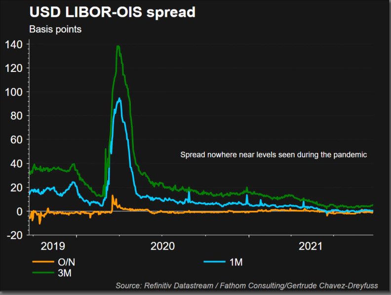 uno dei principali proxy relativi alla tensione sui money market, lo spread OIS-LIBOR, è calato a 3.2. Ad aprile dello scorso anno, nel pieno della pandemia, era arrivato a 135.213. Calma piatta. In compenso, la facility di reverse repo della Fed di New York esplodeva di liquidità depositata dalle banche stracariche di cash e a corto di Treasuries, in attesa che il Tesoro torni a emettere. Insomma, chi si ricorda il congelamento dell’interbancario che anticipò il crollo Lehman capisce intuitivamente che quanto stiamo raccontando da almeno dieci giorni rappresenta una storia totalmente diversa.