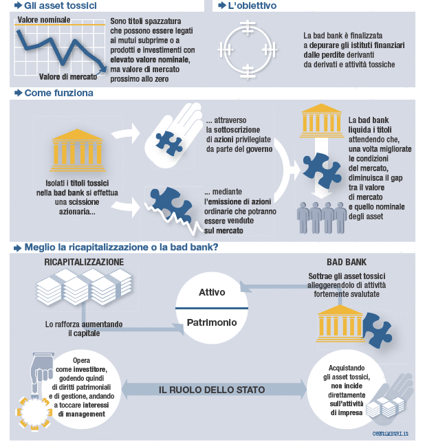 Una volta creata la bad bank vi si fanno confluire tutti i titoli tossici e si effettua una scissione azionaria. Per smaltire i titoli della bad bank si procederà: