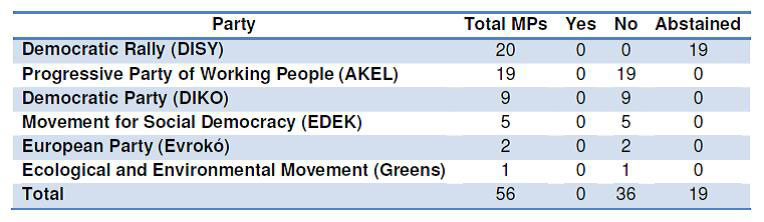 Il partito di maggioranza (DISY) si è astenuto (un membro era assente), mentre la giovane coalizione (DIKO) ha votato contro: un chiaro esempio di come la condizione politica a Cipro sia estremamente divisa. Anche se un accordo per il bailout venisse approvato, la posizione del governo continuerebbe ad essere insostenibile.