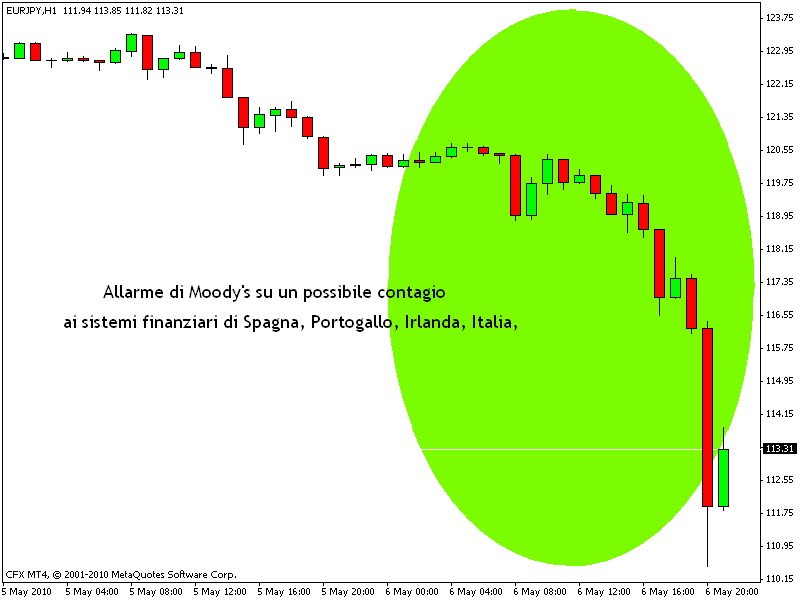 Non si sa se l’Euro ha toccato il fondo nella seduta di ieri. Di certo, resterà nella memoria questa svalutazione sui mercati valutari della valuta europea dopo che da Moody’s sono giunte allarmanti affermazioni sulla possibilità concreta di un contagio della crisi ellenica ai sistemi finanziari di Portogallo, Spagna, Irlanda, Italia (FTSE MIB -5% circa con un profondo rosso dei bancari) e Gran Bretagna (Cable a 1,4730). Clamoroso anche il picco di minimo intraday fatto registrare dal Dow Jones che nel giro di cinque minuti aveva perso il 9% (poi recuperato quasi tutto), che è la peggior perforformance dal crollo del 1987. L’EuroDollaro è giunto in area 1,2530 ma è stata pazzesca la discesa dell’Euro/Yen che ha perso addirittura il 9% circa passando da 120,50 di inizio mattinata a 110,47 in serata, cioè quando Wall Street accelerava al ribasso con flessioni medie comprese tra il 3% e il 4%. E’ crollato anche il cambio Euro/Franco svizzero da 1,4330 a 1,40 ed è stato clamoroso anche il tonfo della Sterlina: ad esempio, Gbp/Jpy ha perso quasi il 9% passando da area 141,50 fino a poco sopra 130. Insomma, il mercato dei cambi è stato messo a “ferro e fuoco” in una sola giornata che resterà sicuramente impressa nella mente di tantissimi trader. La domanda da un milione di dollari adesso è: la discesa dell’Euro è terminata? Penso di no, ma a questo punto i policy maker dovranno intervenire (oggi vertice straordinario anti-crisi) facendo qualcosa di concreto altrimenti l’identità e la stabilità della valuta europea può essere davvero compromessa.