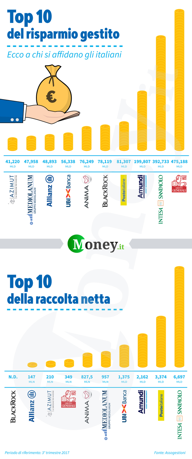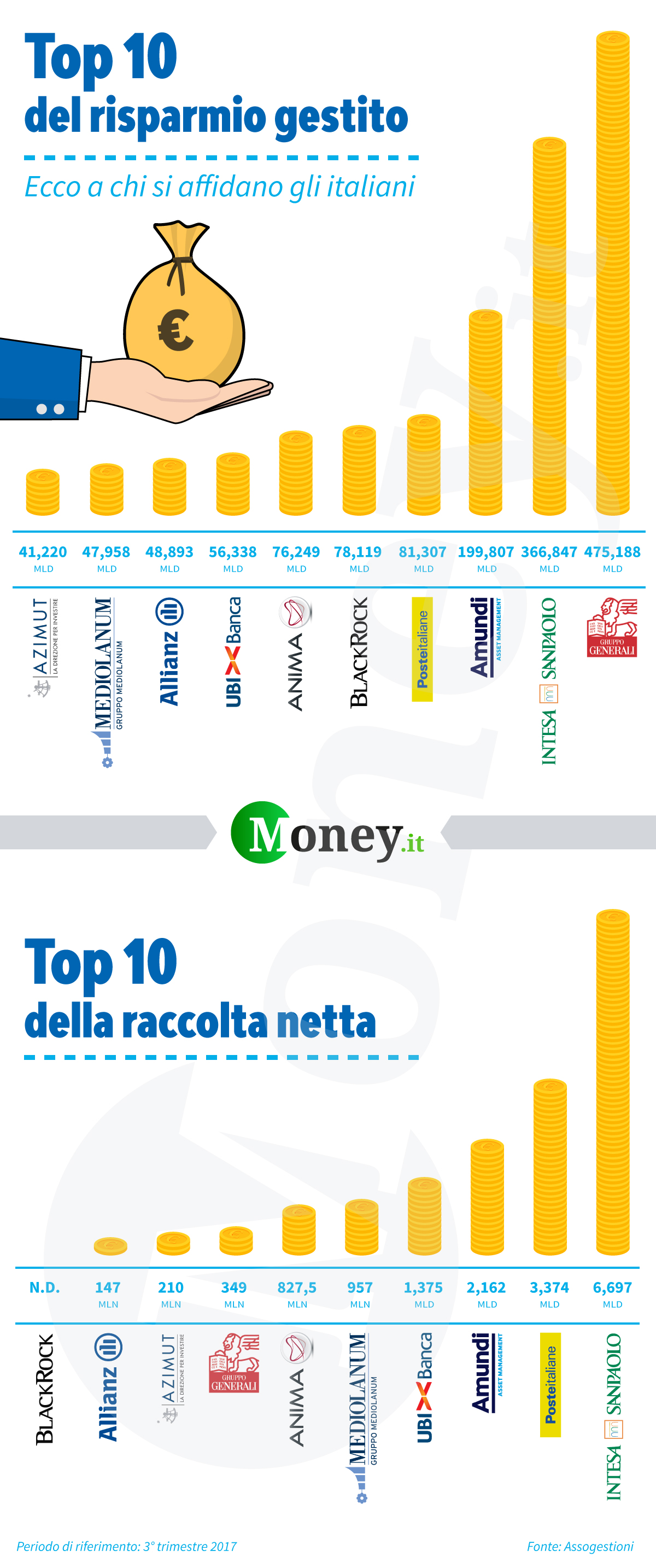 Scopriamolo in questa infografica di Money.it, che riporta la classifica sia sulla base del patrimonio gestito che su quella della raccolta netta.