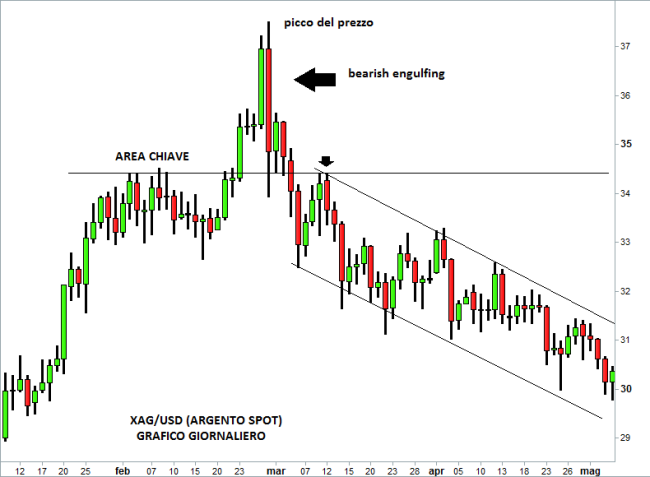 Oggi vediamo come riconoscere un punto di inversione del trend osservando la reazione degli investitori dopo la formazione di un bearish engulfing sul grafico giornaliero dell’argento (Xag/Usd). Dopo un interessante boom dei prezzi (oltre il 10% in poco più di una settimana), il mercato raggiunge un picco e inverte bruscamente la rotta formando un bearish engulfing che genera subito una performance negativa vicina al 6%. E’ un segnale molto netto della presa di posizione dei venditori. Nelle settimane successive i prezzi scenderanno con decisione, fino a tornare sul supporto di 30 dollari.