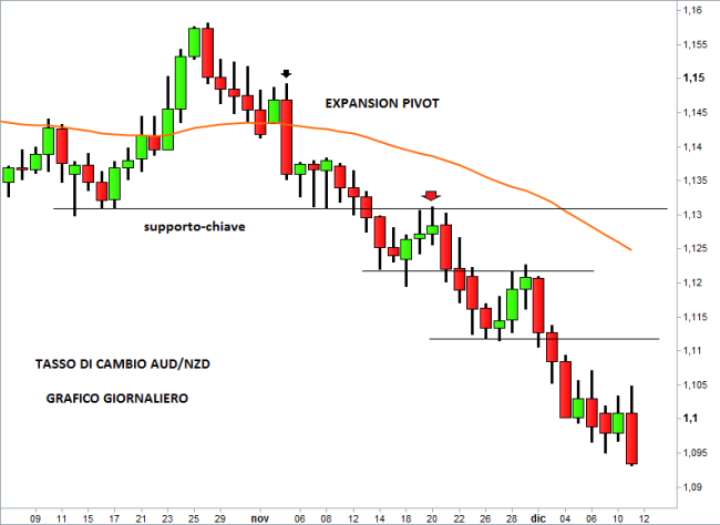 Per capire quanto questi pattern di Cooper basati sui breakout della volatilità siano validi andiamo a studiare un esempio grafico sul tasso di cambio AUD/NZD, ovvero il dollaro australiano sul dollaro neozelandese. Sebbene il primo segnale short sul daily chart venga fornito da un bearish engulfing, qualche giorno dopo scatta un nuovo forte segnale short a seguito della comparsa dell’expansion pivot. La successiva rottura di un supporto-chiave, posto a 1,13, consentirà ai prezzi di generare un forte sell-off con approdo verso 1,09 nelle settimane seguenti.