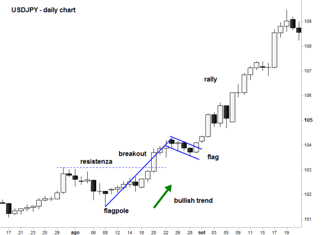 Le flag sono pattern di continuazione del trend che appaiono dopo un forte rally del mercato. Sono piccoli parallelogrammi che si muovono nella direzione opposta alla tendenza di fondo, ma solo per un brevissimo periodo di tempo. Il grafico giornaliero mostrato in alto sul cambio USD/JPY evidenzia una tipica flag apparsa dopo un rally molto sostenuto (che rappresenta invece la “flagpole”). Il breakout rialzista della flag è il segnale long per continuare a cavalcare il trend principale senza grossi patemi d’animo e con grandi chance di ottenere risultati esaltanti.