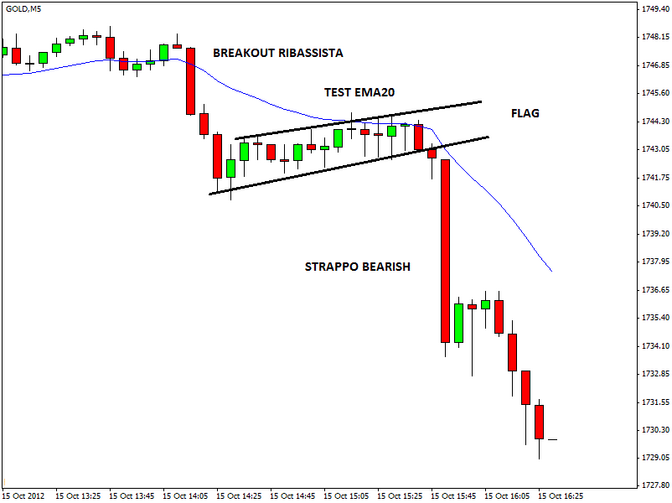 Nell’esempio in alto sull’oro, grafico a 5 minuti, si può notare la tecnica di ingresso sul pullback lungo un forte trend direzionale intraday ribassista. In questo caso la tipologia di pullback utilizzata è il breakout della flag con test della media mobile esponenziale a 20 periodi. Il risultato è spettacolare, a fronte di un rischio iniziale molto contenuto.
