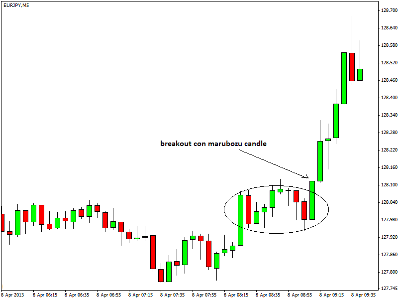 Le candele "marubozu" sono caratterizzate dal fatto che il real body della candela non presenta shadow. Le migliori marubozu sono long candle che si formano dopo una fase di compressione della volatilità o a seguito di un trading range prolungato. In questi casi, la comparsa di una marubozu può indicare un imminente strappo dei prezzi. Andiamo a vedere un esempio grafico, che può aiutarci a comprendere come fare scalping dopo la comparsa di una candela marubozu.