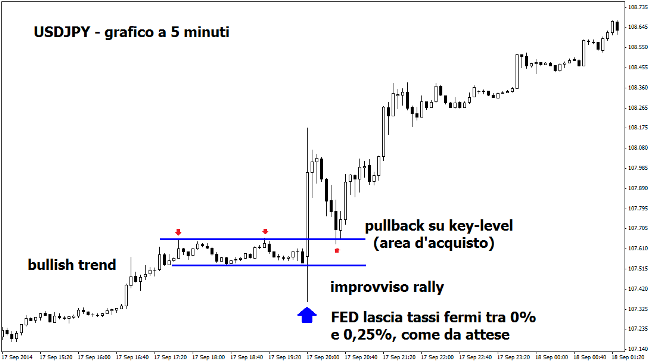 Il grafico in alto si riferisce al tasso di cambio USDJPY, time frame a 5 minuti, interessato da un boom dei prezzi dopo una stretta fase di congestione, che fa seguito all’annuncio della FED sui tassi di interesse. Si forma una long candle rialzista, che realizza un breakout altamente esplosivo in linea con il trend di fondo. A questo punto inizia un pullback, che riporta i prezzi sul key level che in precedenza era stato una resistenza statica. Il livello chiave diventa supporto e area d’acquisto per lo scalper. A fronte di un rischio molto contenuto (stop da inserire sotto la lunga shadow della candela di breakout), era possibile conseguire un rendimento potenzialmente molto elevato.