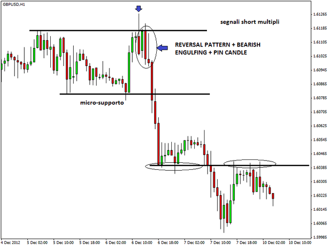 Nell’esempio mostrato nel chart a 60 minuti sul tasso di cambio sterlina/dollaro, si può notare la formazione di un pattern reversal su una zona di resistenza seguito da un bearish engulfing e da una pin candle ribassista. Si tratta di tre segnali short ad elevata probabilità di successo, un rigore senza portiere... Nelle ore successive, infatti, il cable perderà più di 100 pip dal potenziale punto di ingresso sul mercato.