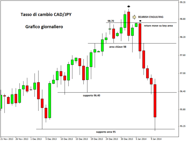 Andiamo subito a studiare l’esempio grafico relativo al cross CAD/JPY, time frame giornaliero, che evidenzia un bearish engulfing sui massimi degli ultimi 9 mesi circa posti poco sopra quota 99. Il segnale non dà subito i frutti sperati, tanto è vero che il giorno seguente si forma una pin candle con bottom a 97.70 che fa ripartire i prezzi. Tuttavia, il rimbalzo ha vita breve: i compratori vengono respinti sulla key-area di 98.70, dove è possibile aprire posizioni short a basso rischio e dal potenziale rendimento molto elevato. Nel giro di 5 sessioni di trading, le quotazioni crollano clamorosamente di circa 300 pip.