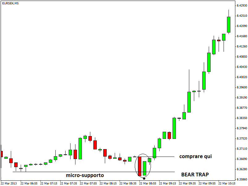 Nell’esempio sul tasso di cambio EUR/SEK (euro su corona svedese), time frame a 5 minuti, viene mostrato come fare trading intraday sui falsi breakout. Quello che sembra una rottura scontata di un micro-supporto (long candle di tipo marubozu), diventa improvvisamente una bear trap. I venditori vengono ingannati e inizia un trend emergente rialzista molto robusto. Il rapporto rischio/rendimento è solitamente molto vantaggioso.