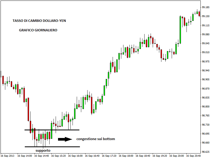 Oggi vediamo come fare trading intraday sulla tenuta di un supporto. Il case study presentato è relativo al tasso di cambio dollaro-yen, time frame a 5 minuti. Gli acquirenti provano a fermare la discesa dei prezzi avvenuta in precedenza. Si forma una congestione sui bottom di giornata e le candele presentano una lower shadow prolungata sulla stessa area supportiva. Il breakout del ledge indica la possibilità di un’inversione del trend nel breve periodo.