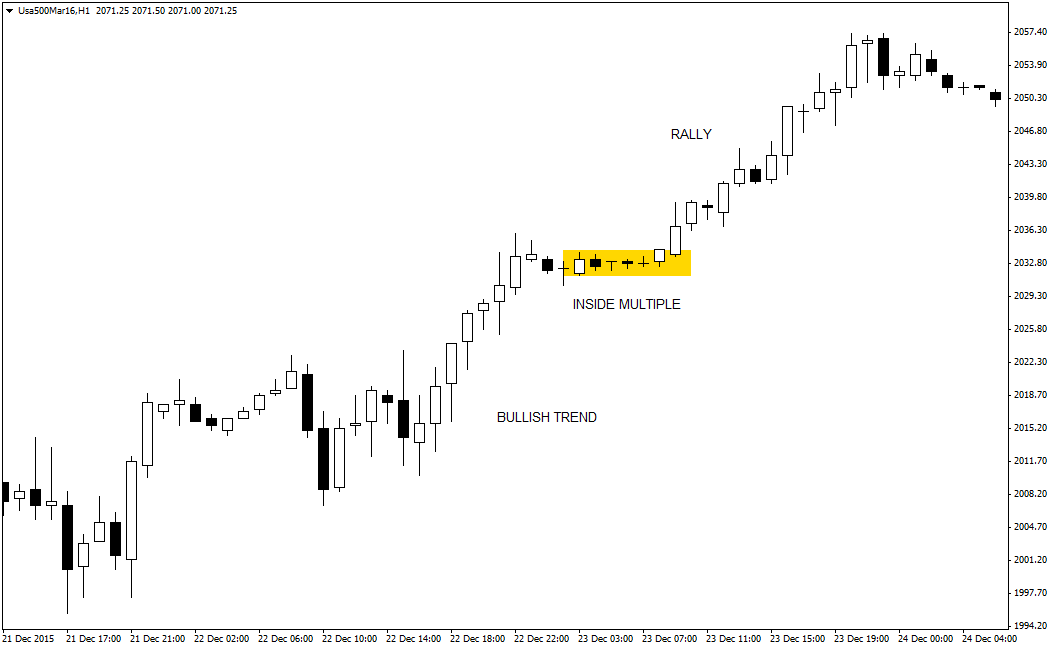 Una tipologia di congestione dei prezzi potenzialmente molto profittevole è quella delle candele inside multiple, che in genere vanno a formare una stretta fase di consolidamento con tanto di compressione della volatilità. Il successivo breakout della candela “madre”, che contiene tutte le “inside candle”, rappresenta il momento ideale per entrare sul mercato nella direzione del trend principale, come accaduto ad esempio al CFD sull’indice S&P500, grafico a un’ora, evidenziato in alto.