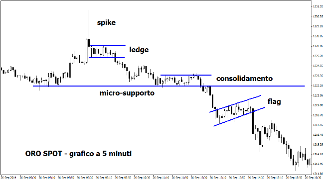 Successivamente, dopo l’esaurimento della tendenza di fondo, inizia a formarsi una fase di consolidamento molto stretta (ledge). Il successivo breakout della congestione è il segnale di inversione del trend da utilizzare sia in ottica di scalping che di day trading. Il pattern può anche essere utilizzato su base multiday. Nel grafico in alto mostrato sull’oro spot, time frame a 5 minuti, si può notare la comparsa di uno Spike & Ledge ribassista, che dà il via a un trend discendente molto solido nel corso della seduta.