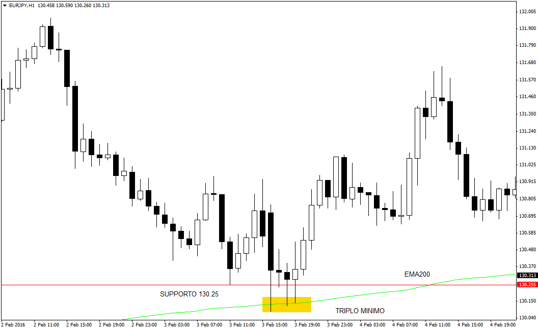 Il grafico in alto si riferisce al cross Euro/Yen, time frame intraday a 60 minuti, sul quale si può scorgere un trend ribassista che a un certo punto trova un’area di appoggio. Siamo intorno alla zona psicologica di 130 e qui iniziano a configurarsi segnali grafici multipli. Innanzitutto un supporto statico a 130,25; poi un triplo minimo ravvicinato; infine, la presenza della media mobile esponenziale a 200 periodi, sulla quale i prezzi rimbalzano. Il segnale long è piuttosto netto e non a caso avverrà una forte risalita nelle ore successive.