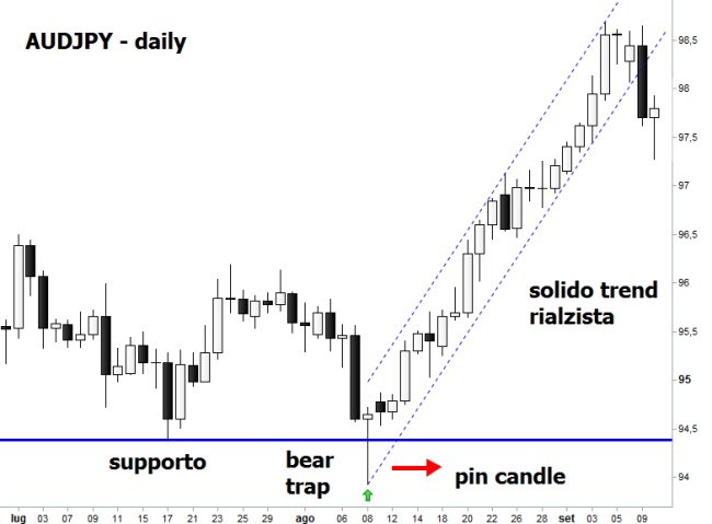Inoltre funzionano alla grande se alla pin candle viene accompagnata una trappola degli specialisti (bull trap o bear trap). Nell’esempio mostrato in alto sul cross AUDJPY, time frame daily, si può notare una pin candle di tipo reversal praticamente perfetta: la forma è ottima, appare su un supporto chiave ed evidenzia una bear trap. Non si potrebbe chiedere di meglio.