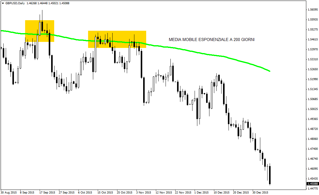 Il grafico in alto mostra il quadro tecnico sul tasso di cambio Sterlina/Dollaro (GBP/USD), time frame giornaliero, sul quale è possibile notare la presenza della media mobile esponenziale a 200 giorni. L’indicatore funge da livello dinamico di resistenza ed evidenzia alla grande una zona di potenziale vendita allo scoperto. Da questi livelli il Cable verrà sempre respinto, fino a crollare in modo rovinoso nel giro di alcune settimane.