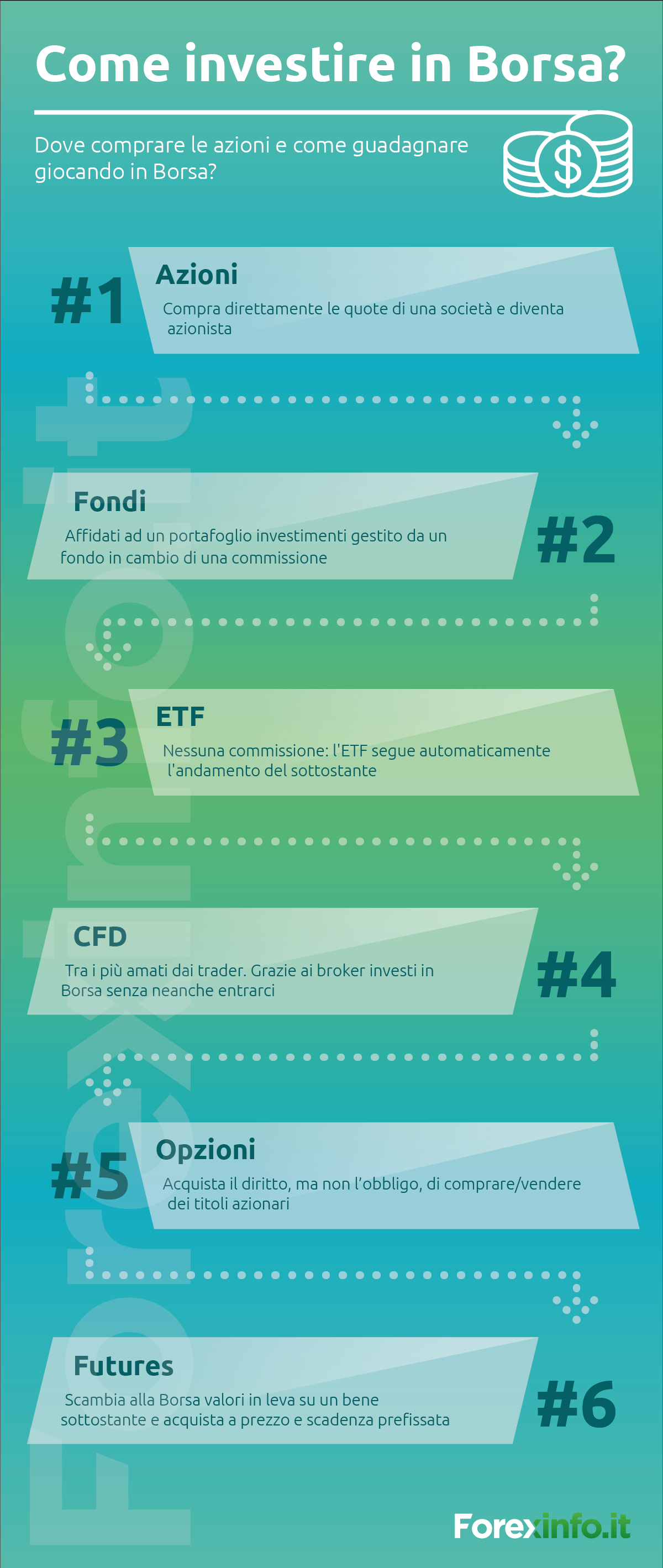Ecco un’infografica che illustra le 6 possibili vie da poter scegliere per iniziare finalmente ad investire in borsa.