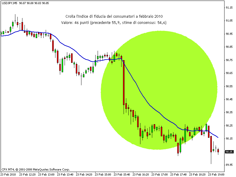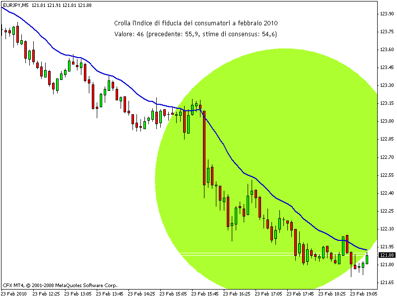 La reazione degli investitori alla pubblicazione di un market mover varia moltissimo e ad essa va aggiunta anche la volatilità di breve periodo presente su un tasso di cambio che potrebbe generare escursioni di prezzo molto ampie in contesti di iper-attività degli operatori. Ad esempio, in un clima di avversione generalizzata al rischio (risk aversion), soprattutto sull’equity, e un trend favorevole già consolidato per lo Yen (che presenta quasi sempre una correlazione inversa con l’andamento delle Borse), la pubblicazione di un market mover con valori ampiamente al di sotto delle attese può provocare facilmente un’ondata di acquisti sulla valuta nipponica (la più soggetta ai carry trade per i tassi storicamente pari a zero che spingono verso operazioni di deleveraging nei momenti di maggiore incertezza). Il 23 febbraio 2010 venne pubblicato il dato sulla fiducia dei consumatori americani con un valore di 46 punti, ben al di sotto sia delle stime (54,6) che della rilevazione precedente (55,9). Il mercato reagì prontamente acquistando Yen, provocando forti discese su tassi di cambio come l’Eur/Jpy e l’Usd/Jpy.